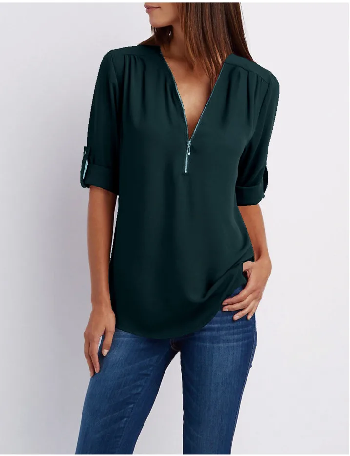 Camisa Feminina Chiffon com gola V em detalhe com zíper e  manga longa .