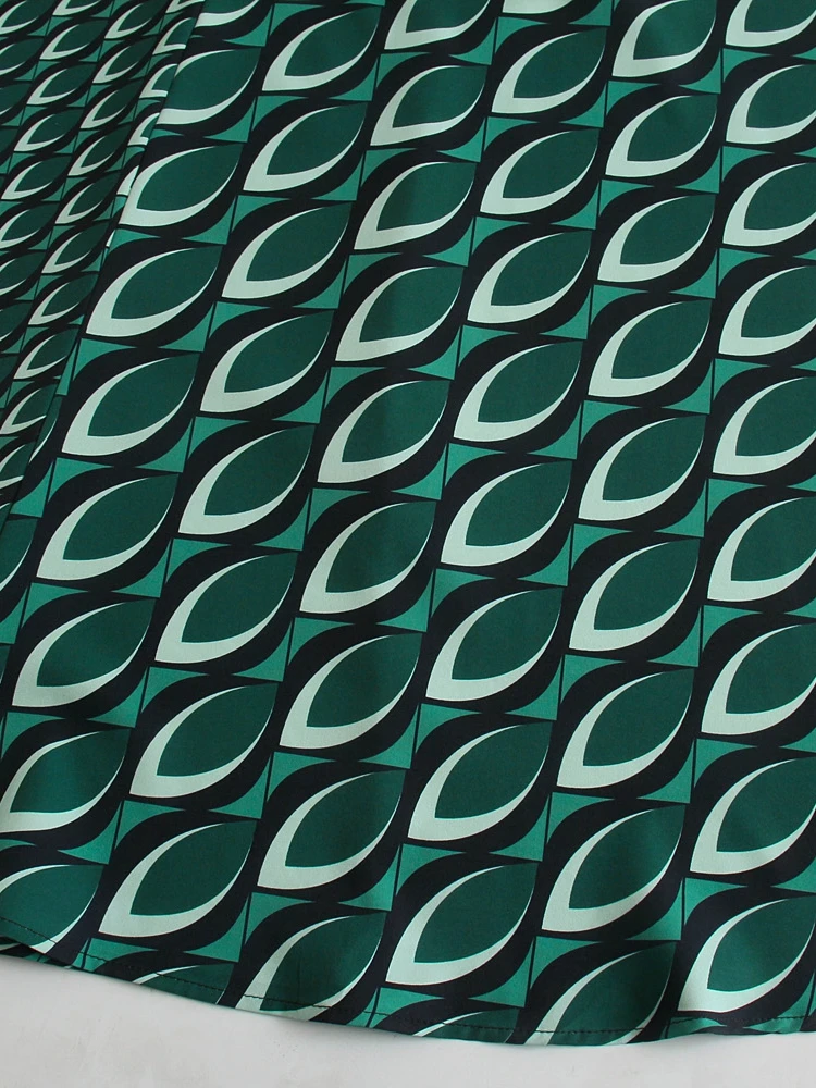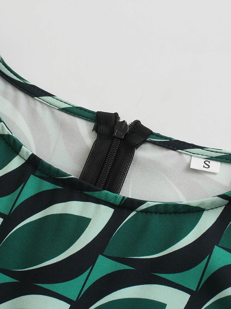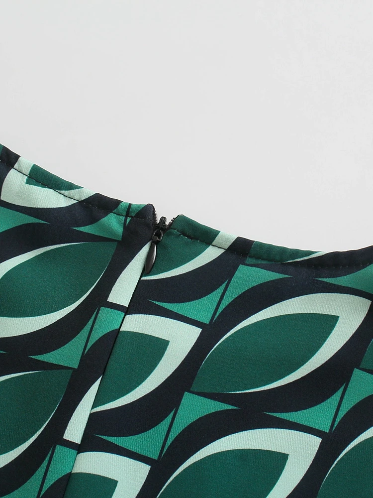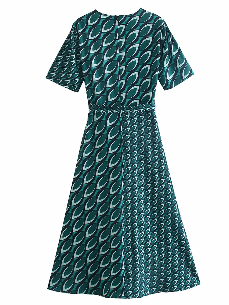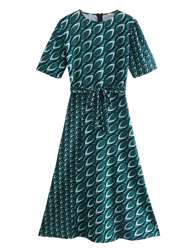 Vestido estampado Verde evasê,manga curta , abertura de zíper na parte de trás até a cintura , acompanha cinto do mesmo tecido .