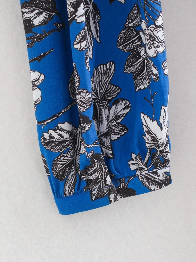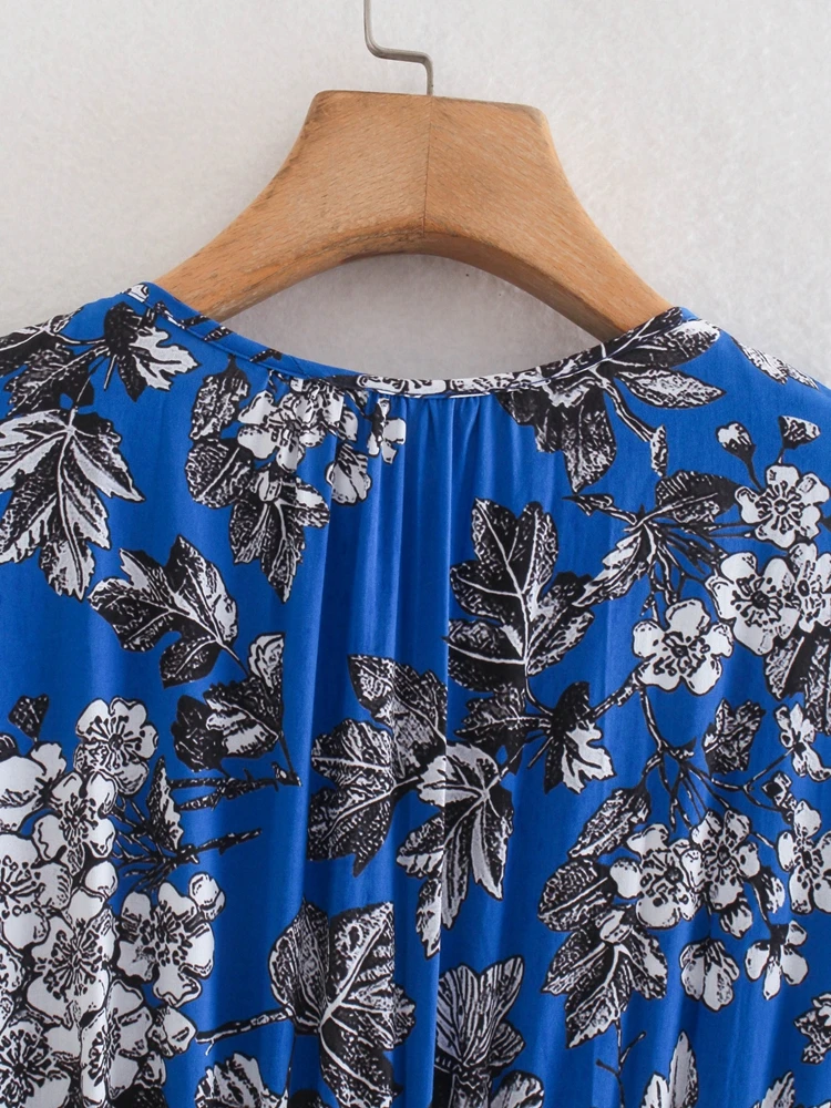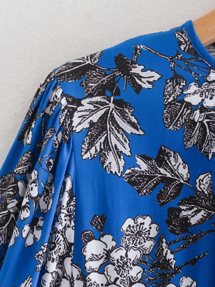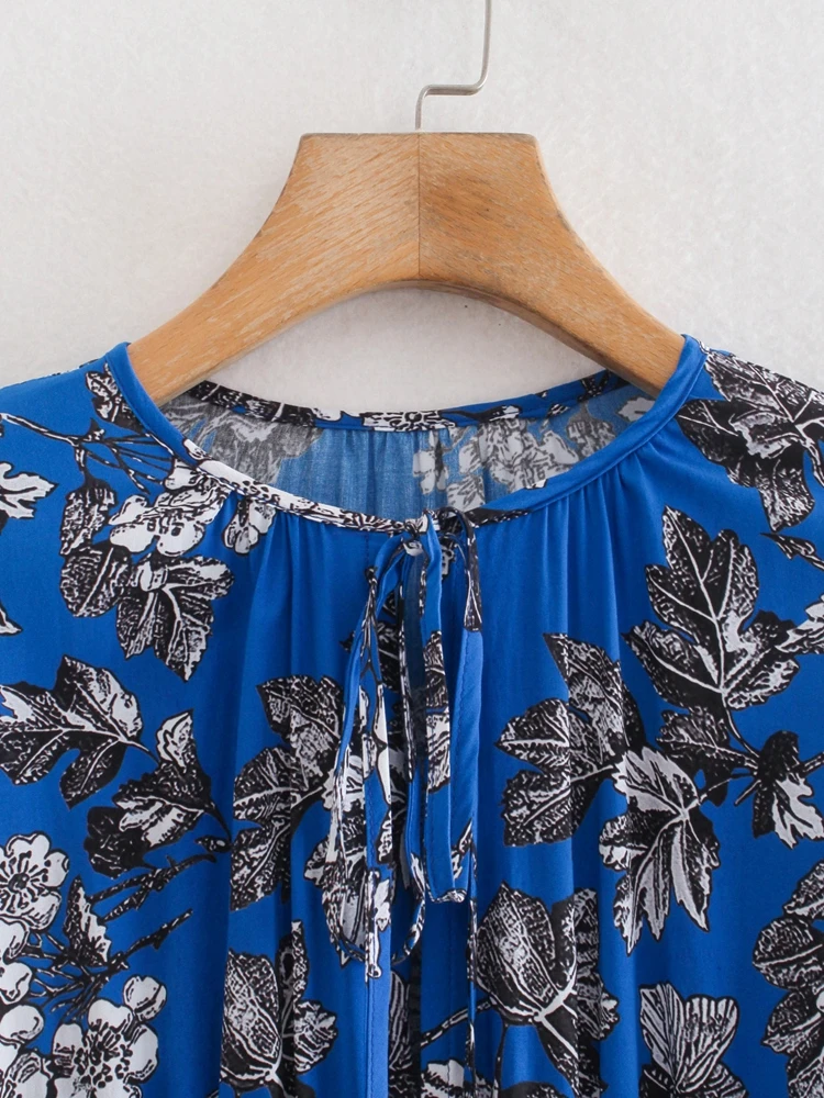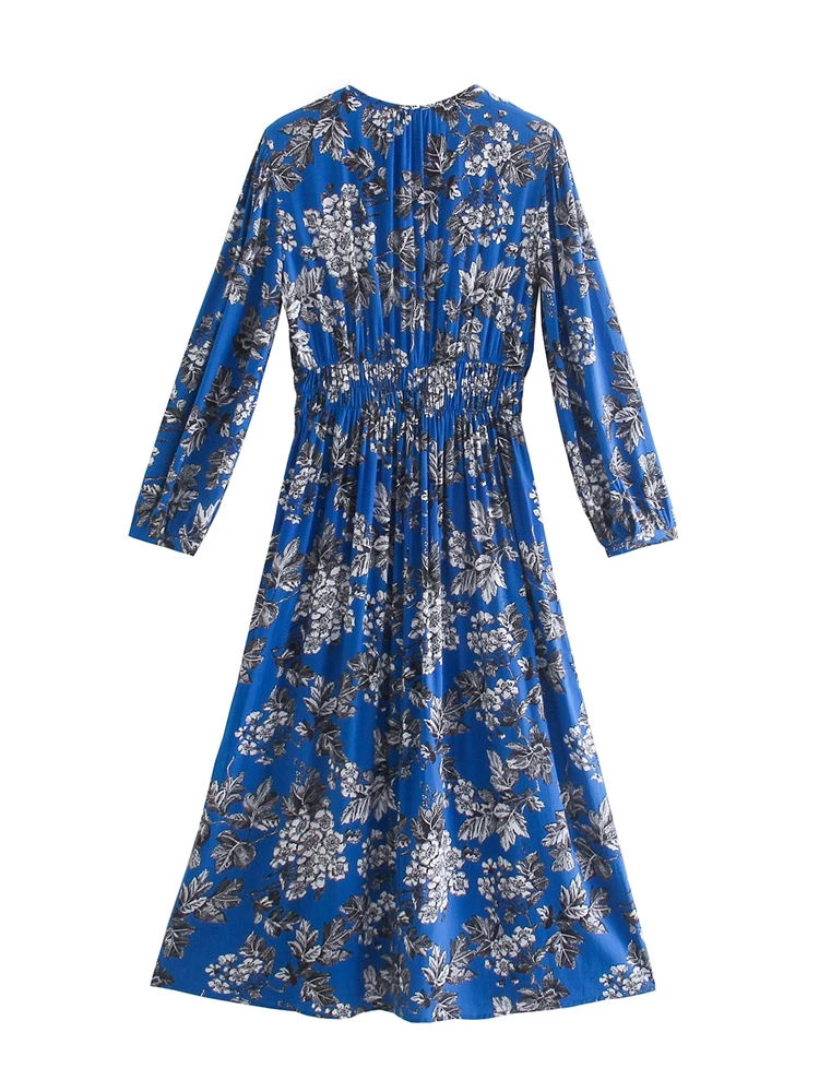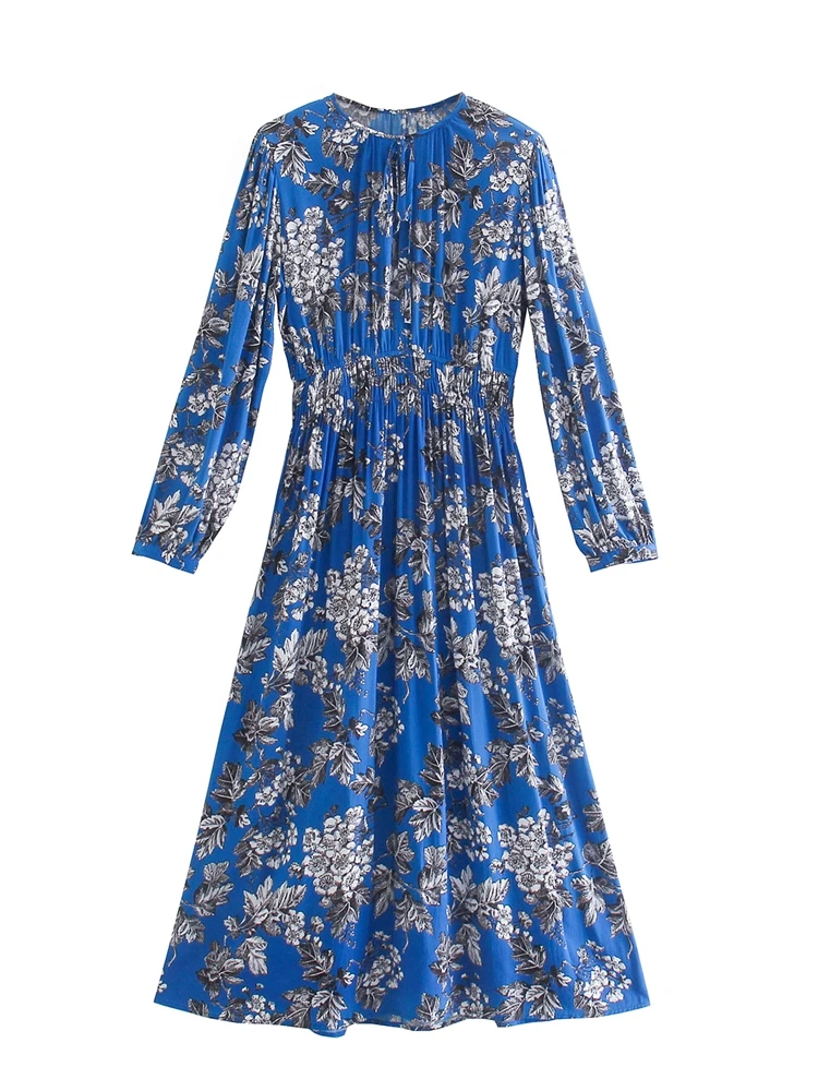 Vestido Midi Estampado evasê, manga longa com punho, franzido na gola e na cintura, abertura gota com amarração na parte de trás.