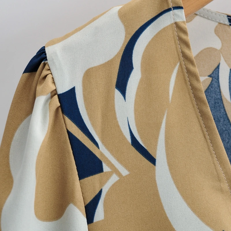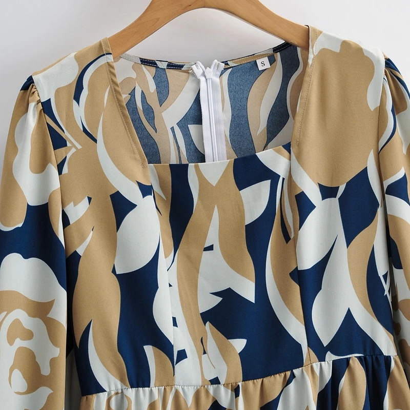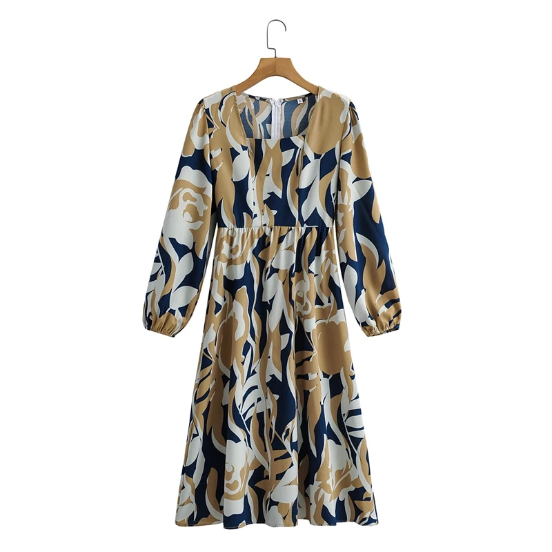 Vestido Midi Estampado Floral, manga 7/8 com elástico, franzido na cintura, abertura de zíper na parte de trás.