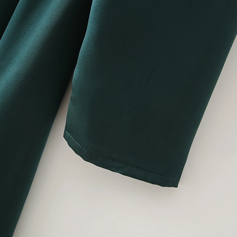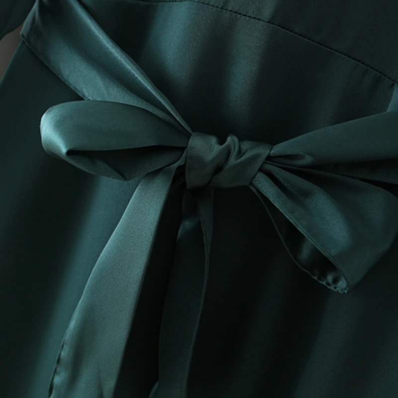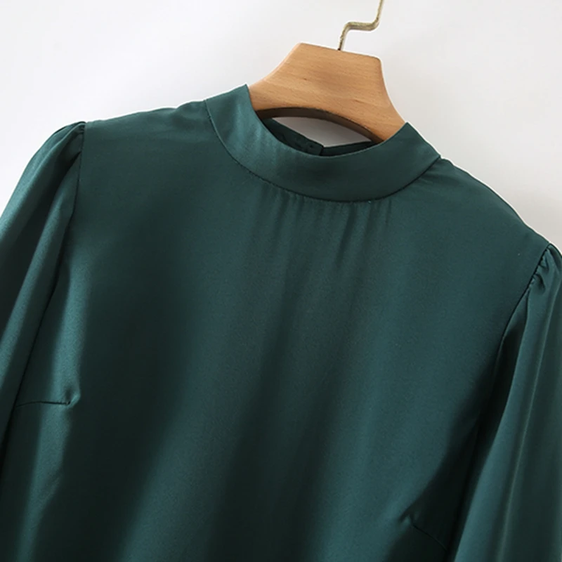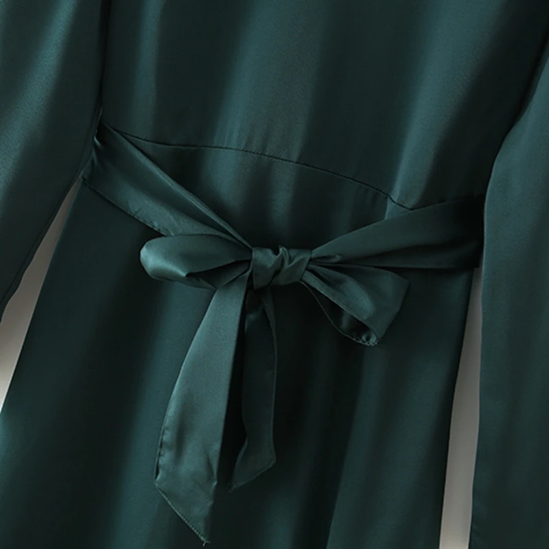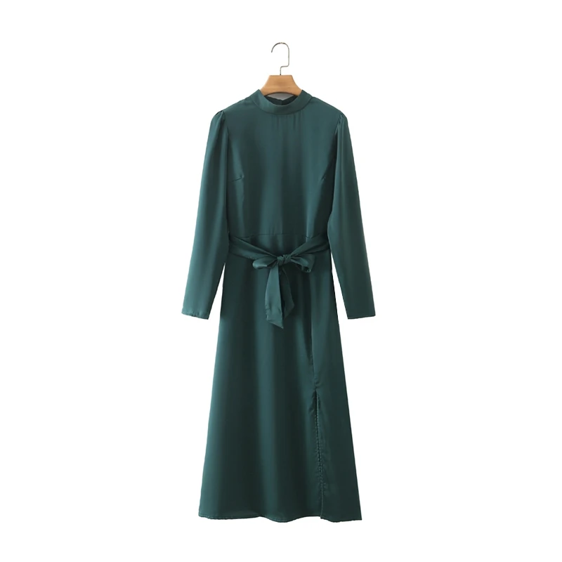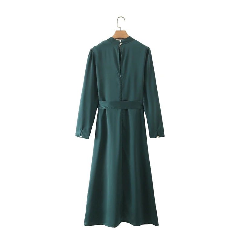 Vestido Midi Verde  Cetim, gola bertha, manga Longa, franzido no ombro, abertura atrás gota com botões, fenda lateral acompanha uma faixa de cetim da cor do tecido para amarração.