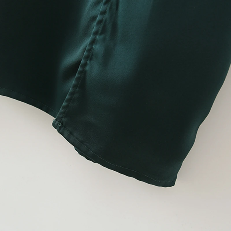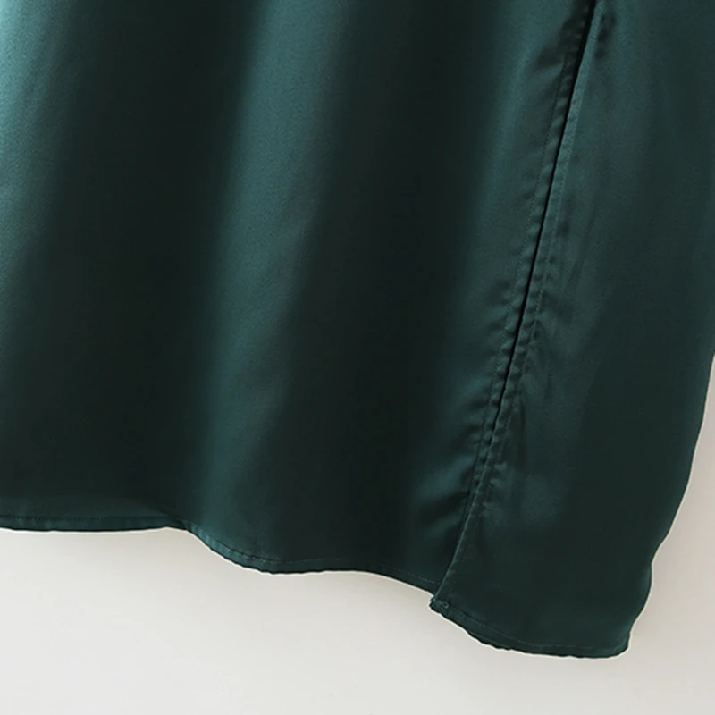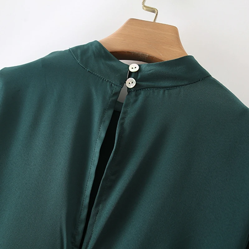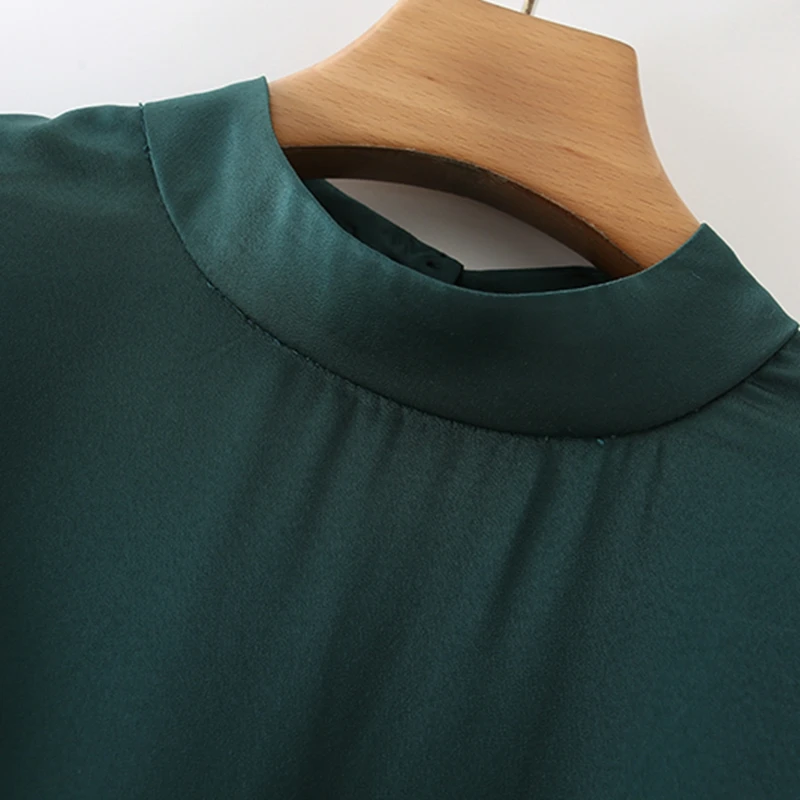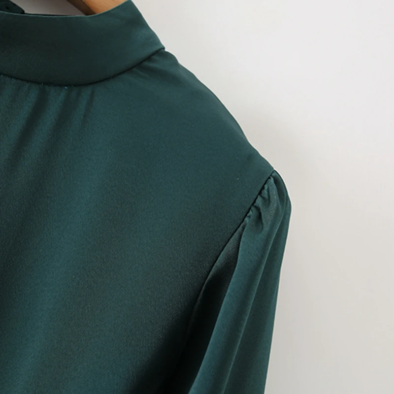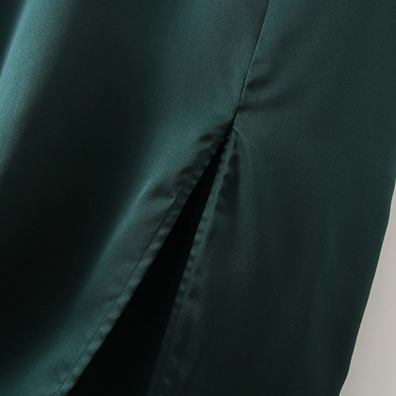 Vestido Midi Verde  Cetim, gola bertha, manga Longa, franzido no ombro, abertura atrás gota com botões, fenda lateral acompanha uma faixa de cetim da cor do tecido para amarração.